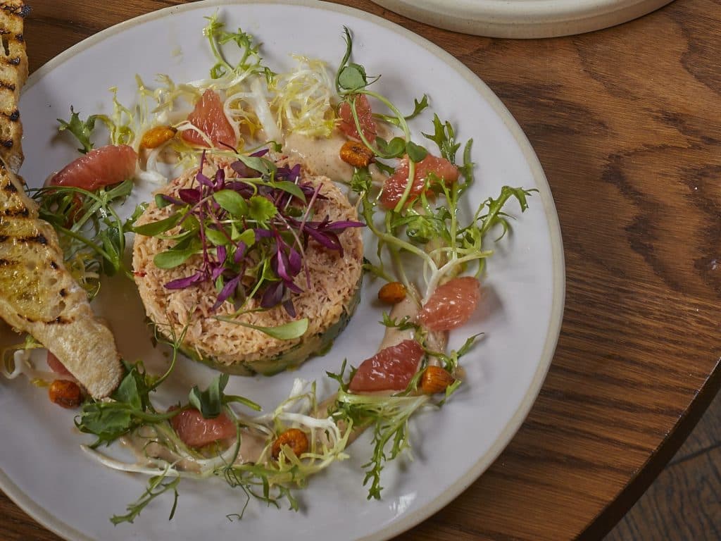 Then there’s the Devon Crab and Avocado, served with brown crab mayonnaise, a zingy hit of pink grapefruit, fresh coriander, spiced corn and toasted garlic croutons. Elegant, fresh and just a little bit indulgent.