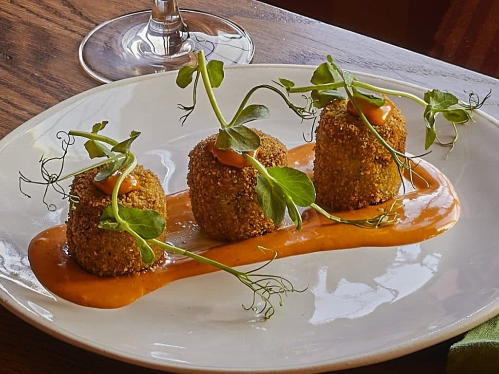 We haven’t forgotten you, not even a little bit. The Pea and Broad Bean Salad is a real celebration of the season: frisée, roasted piquillo peppers, crispy shallots, fried broad beans, a tomato chilli vinaigrette and a pea and feta cheese croquette alongside.