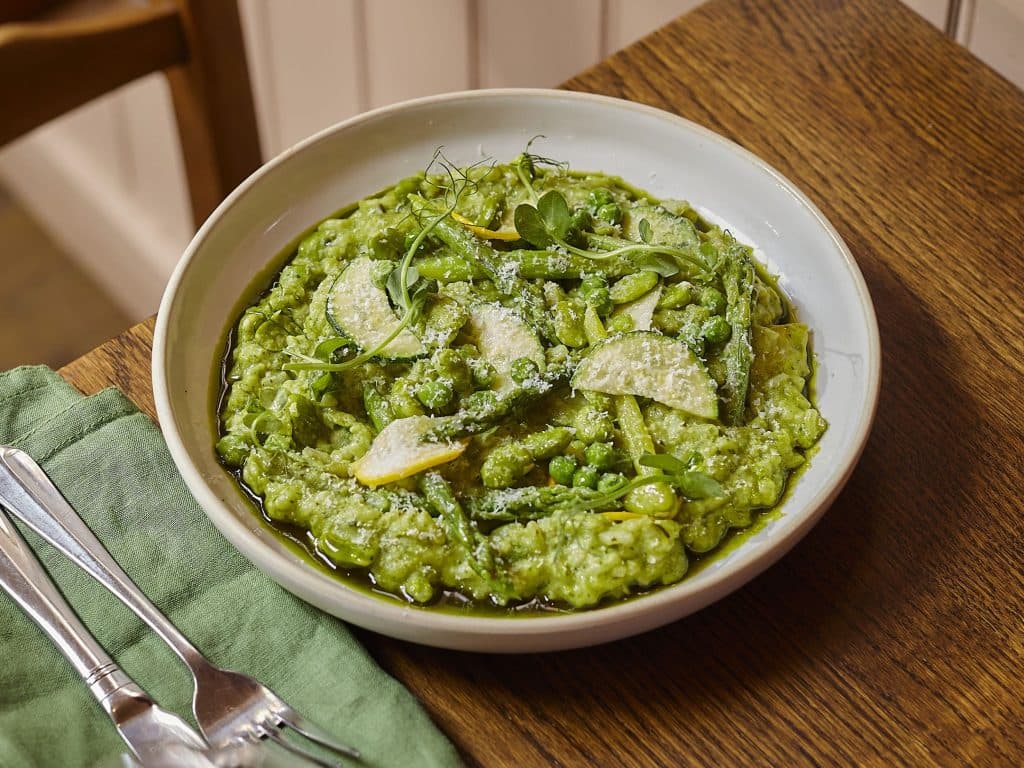 And the Spring Vegetable Risotto is a real showstopper in its own right. Wild garlic, pea veloute, Grana and chive oil, all coming together in one beautifully balanced, deeply comforting bowl. This is spring, plated up and ready to go.